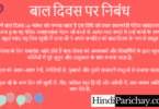 बाल दिवस के दिन 14 नवम्बर पर निबंध लेख व बाल दिवस की महत्वपूर्ण पंक्तियाँ बोली जाती है। बाल दिवस के दिन हमारे पूजनीय जवाहर लाल नेहरू जी का जन्मदिन मनाया जाता है और उनकी याद में सभी नए युवकों को उनके बारे में बताया जाता है जिन्हें सम्पूर्ण जानकारी नहीं है वो बाल दिवस के दिन बाल दिवस के भाषण को सुन कर काफी अच्छी जानकारी प्राप्त कर सकते है।