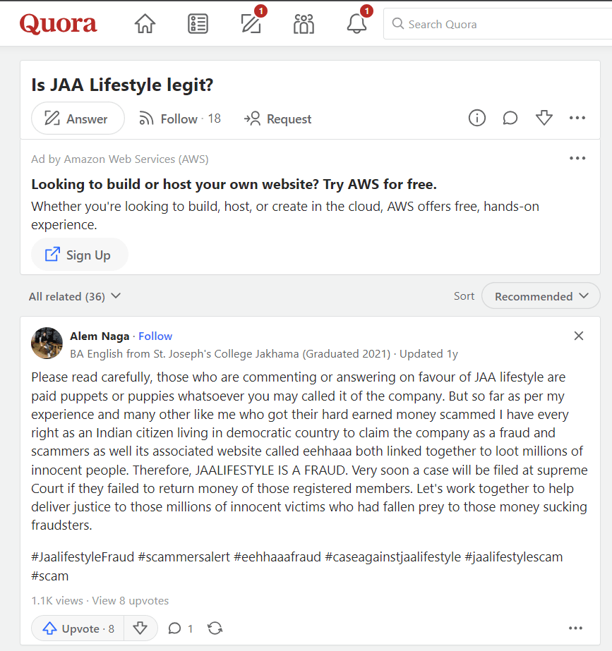 Is JAA Lifestyle legit? जा लाइफस्टाइल भी उन साइटस की तरह है जिससे आप भी घर बैठे या कही भी बैठे पैसे कमा सकते है। जैसे की लोग खेल खेलकर या फिर कोई लिंक एक दूसरे को रेफर करके पैसे कमाते है, ठीक उसी तरह जा लाइफ़स्टाइल भी है जहां से लोग आपको नेटवर्किंग बनाने के लिए कहता है और विज्ञापनों को देखकर पैसे कमाने का अवसर देता है।