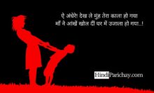“माँ” मुझे अँधेरे से डर लगता है, मगर जब आप साथ होती हो तो मैं हमेशा बिना डरे सो जाता हूँ| “माँ”, माँ मैं आपसे बहुत प्यार करता हूँ और आपके लिए दुनिया की हर ख़ुशी आपके चरणों में रखता हूँ.