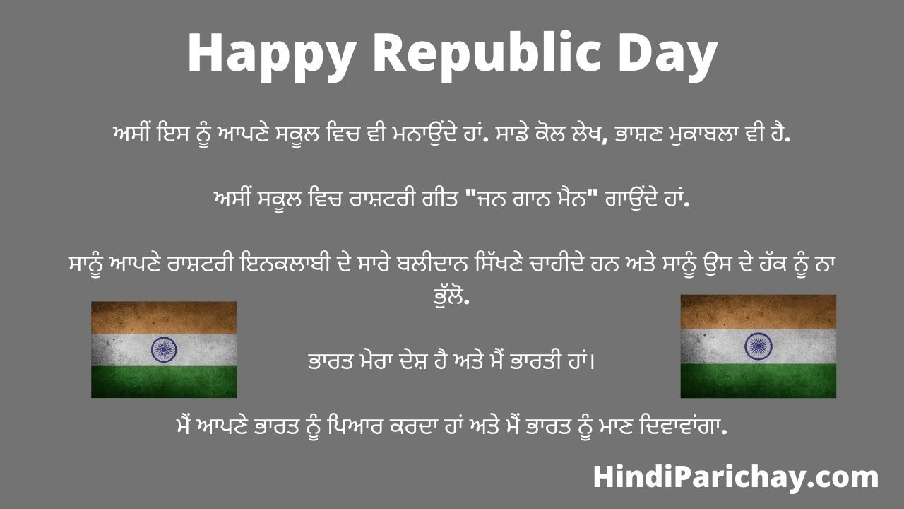 26 जनवरी 1950 से ही गणतंत्र दिवस मनाया जा रहा है और प्रत्येक वर्ष 26 जनवरी पर देश भर में देश भक्ति गीत गाये जाते है, जलसा निकाला जाता है। भारत की आजादी के दिनों के बाद जब 26 जनवरी को भारत अपने गणराज्य देश के रूप में सामने आया तो दुनिया इस दिन को राष्ट्रीय त्यौहार के रूप में मनाने लगी। भारत की करोड़ों की आबादी में विभिन्न धर्मों के बीच विभिन्न रीति रिवाजों के बीच इस त्यौहार को सभी लोग मनाते है। भारत की आजादी, भारतीय गणतंत्र दिवस, और महात्मा गांधी जी का जन्मदिन राष्ट्रीय पर्व कहलाता है। लोगों की जरूरतों के हिसाब से मैंने 10 Lines on Republic Day in Punjabi लिखी है।