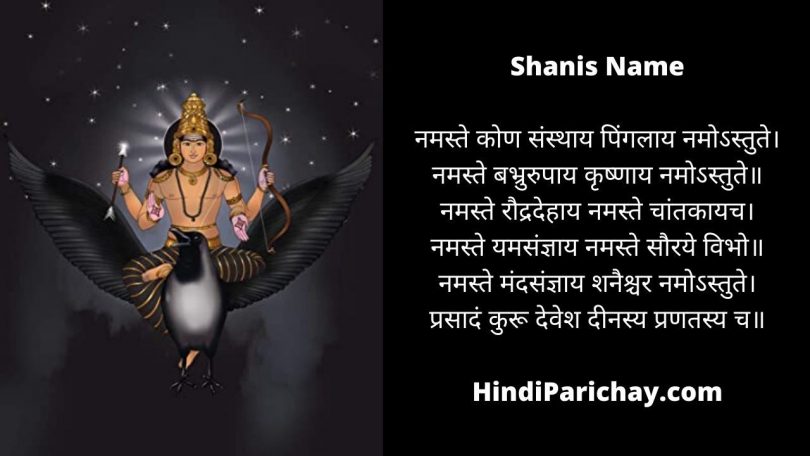 नमस्ते कोण संस्थाय पिंगलाय नमोऽस्तुते। नमस्ते बभ्रुरुपाय कृष्णाय नमोऽस्तुते॥ नमस्ते रौद्रदेहाय नमस्ते चांतकायच। नमस्ते यमसंज्ञाय नमस्ते सौरये विभो॥ नमस्ते मंदसंज्ञाय शनैश्चर नमोऽस्तुते। प्रसादं कुरू देवेश दीनस्य प्रणतस्य च॥
